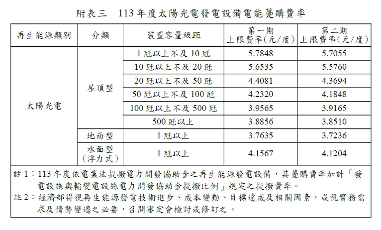 民國113年(西元 2024年)購電費率